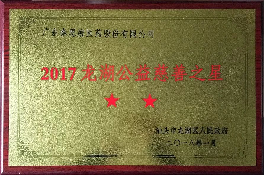 據(jù)了解,此次接受授牌共有17家企業(yè)。其中,廣東泰恩康醫(yī)藥股份有限公司等7家企業(yè)及個(gè)人被授予“龍湖公益慈善之星”二星榮譽(yù)。